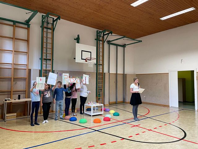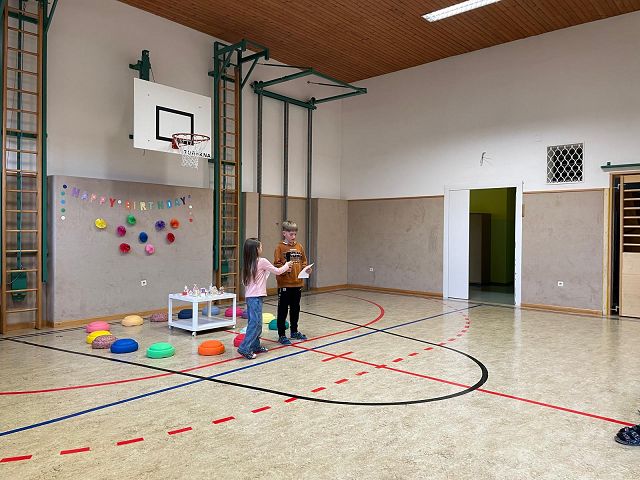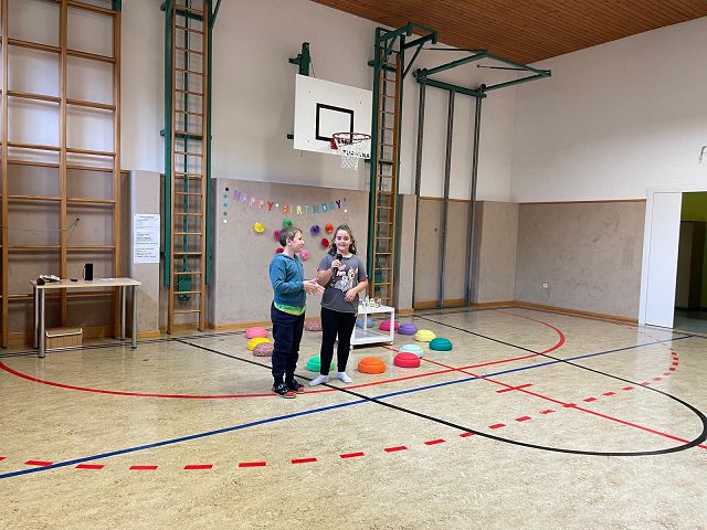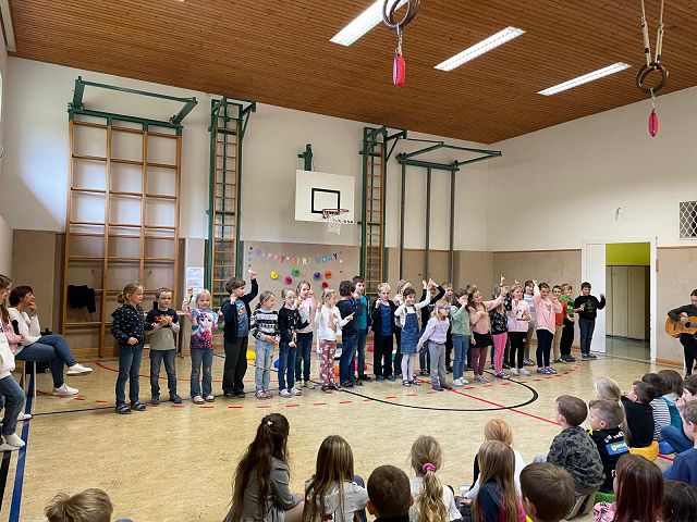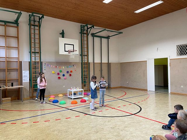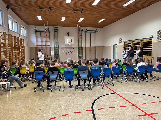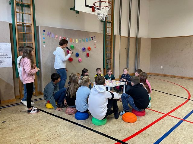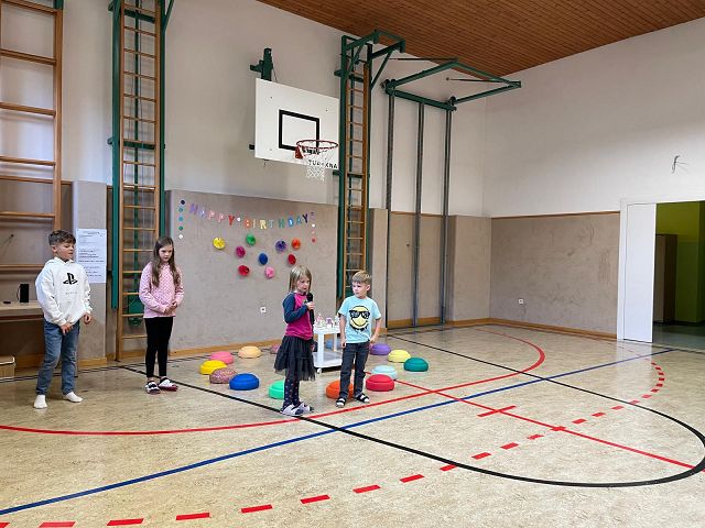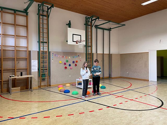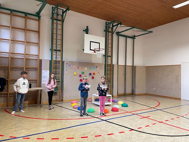 Am 24. Oktober 2025 fand unsere erste Schülervollversammlung in diesem Schuljahr statt. Die Kinder der 4a Klasse übernahmen dieses Mal die Moderation. Sie führten mit viel Freude und Sicherheit durch das abwechslungsreiche Programm. Zu Beginn wurden die Geburtstagskinder der letzten Wochen gefeiert. Anschließend lasen die Klassensprecher Dankessprüche vor. Danach folgten mehrere selbst ausgedachte Beiträge der Kinder, die sie mit Begeisterung vortrugen. Musikalisch wurde die Schülerversammlung ebenfalls gestaltet: Die Kinder der 3. Klasse sangen ein englisches Lied, das sie im Englischunterricht geübt hatten. Die beiden 2. Klassen trugen ein Gedicht zum Thema Freundschaft vor und sangen anschließend ein Herbstlied.