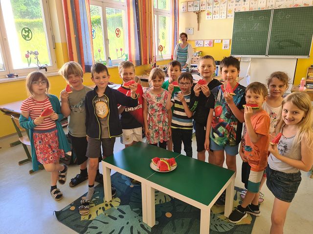 Unser aktueller Schulentwicklungsplan beinhaltet das Bildungsziel – Verbesserung des Gesundheitsbewusstseins aller Lernenden mit dem Schwerpunkt Ernährung. Durch verschiedene gesundheitsfördernde Aktionen und Projekte versuchen wir dieses Bildungsziel zu erreichen, und die Gesundheit unserer Schülerinnen und Schüler soweit wie möglich zu fördern und zu verbessern. Eines dieser Projekte ist die Aktion: „Pausenobst für alle“. Die Lehrkräfte besorgen seit März ein-bis zweimal im Monat für alle 98 Kinder Obst für die große Pause. Es wird versucht auf Saisonalität oder Regionalität zu achten, jedoch soll das Angebot auch vielfältig und schmackhaft sein. Das Angebot umfasste bis jetzt Äpfel, Bananen, Erdbeeren und Melonen. Das „Obstbuffet“ wurde von allen Klassen sehr gut angenommen. Wir hoffen diese Aktion auch im kommenden Schuljahr fortführen zu können und eventuell durch ein Gemüseangebot zu ergänzen.