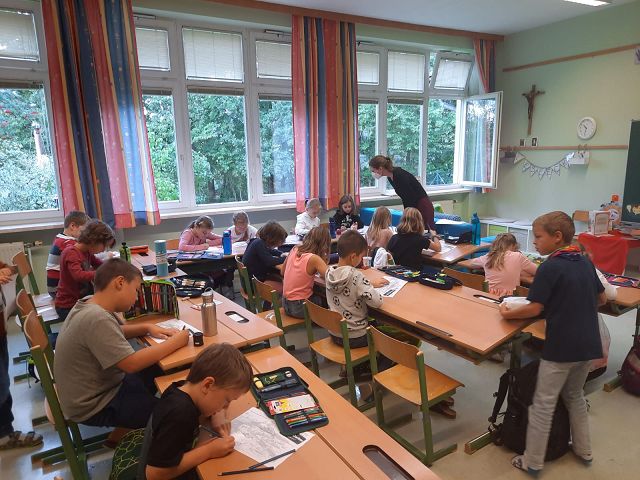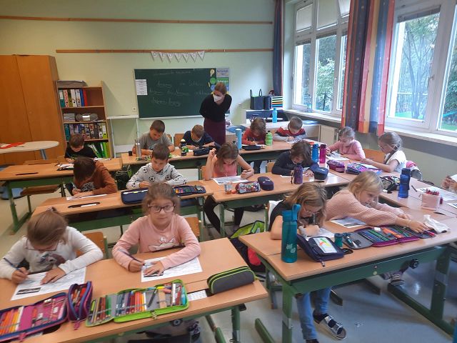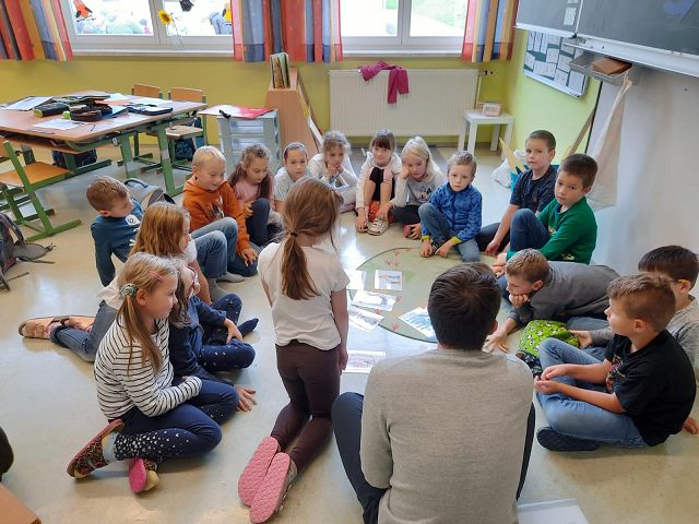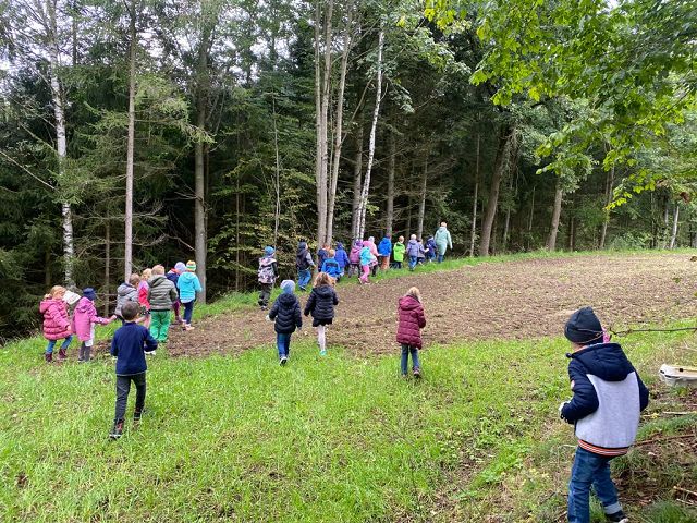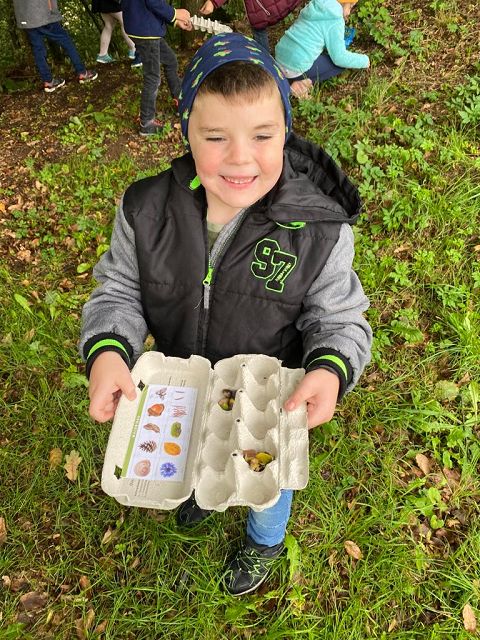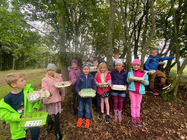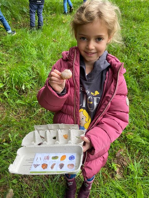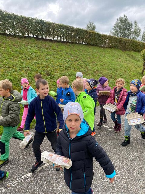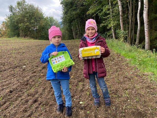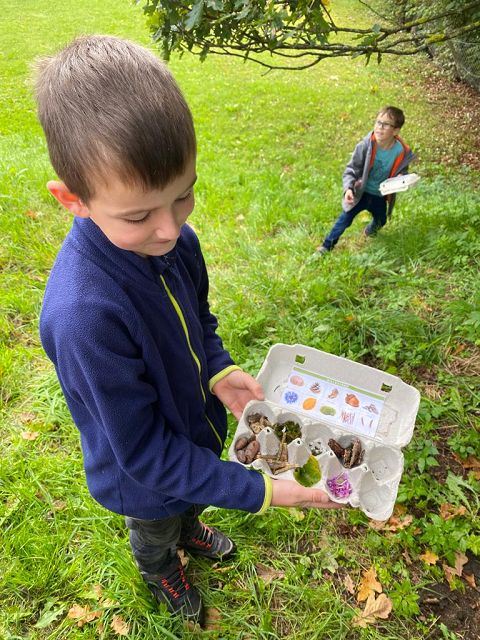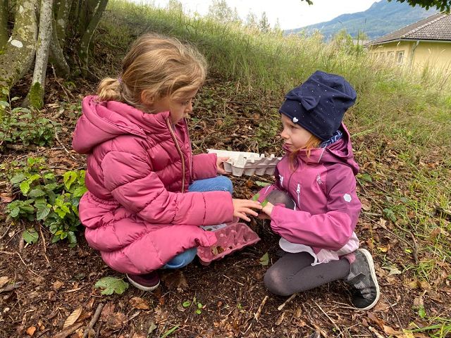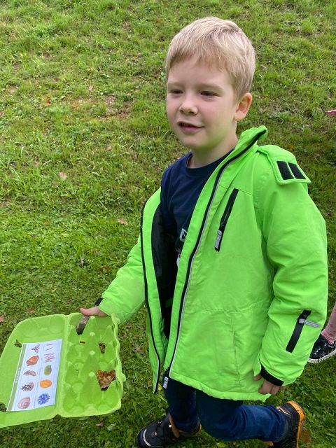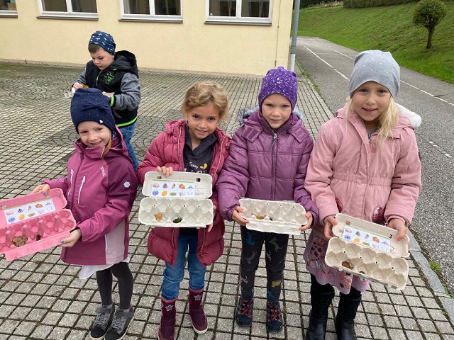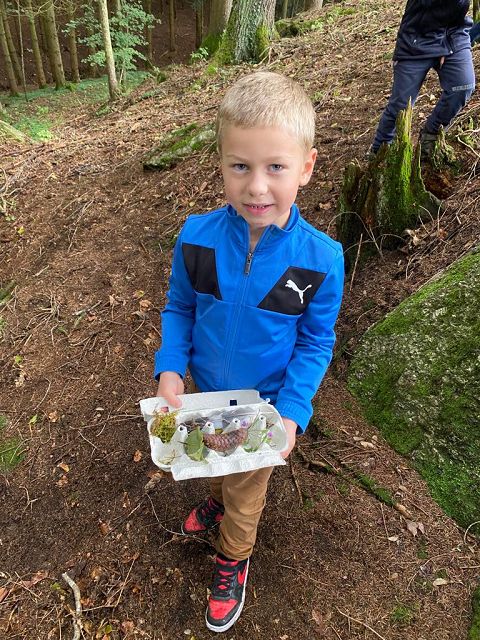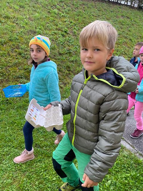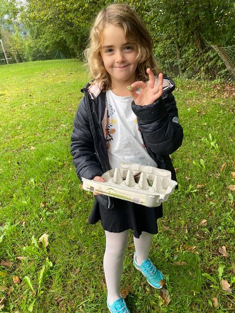 Pünktlich zum Herbstbeginn beschäftigten sich die beiden ersten Klassen mit dem Thema Herbst – und seine Früchte. Ausgerüstet mit einem „Waldbingobild“ und einem leeren Eierkarton spazierten die Kinder in das nahegelegene Waldstück oberhalb der Schule und gingen auf „Entdeckungs-und Sammeltour“. Bald waren die Eierkartons bis zum Rand voll und mit vielen kleinen „Waldschätzen“ gefüllt. Luis aus der 1b Klasse meinte dazu : „Was für ein Abenteuer in der Schule!“