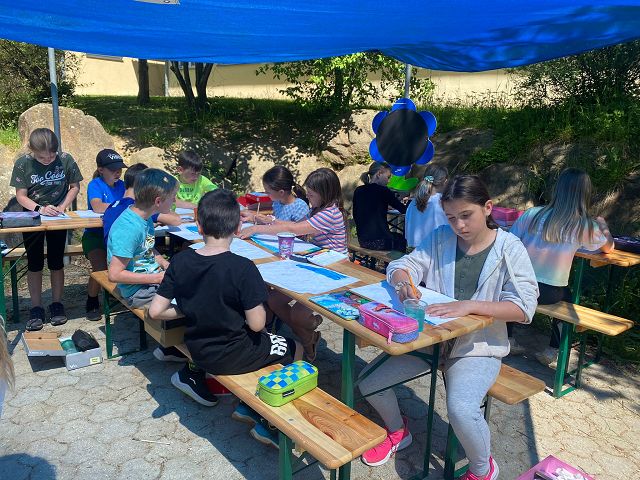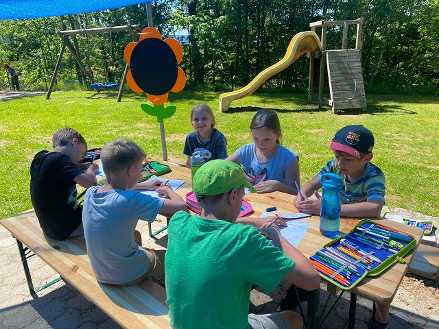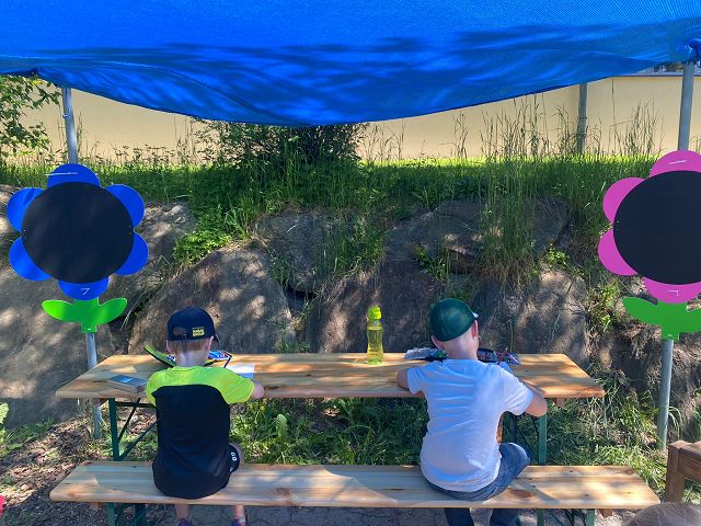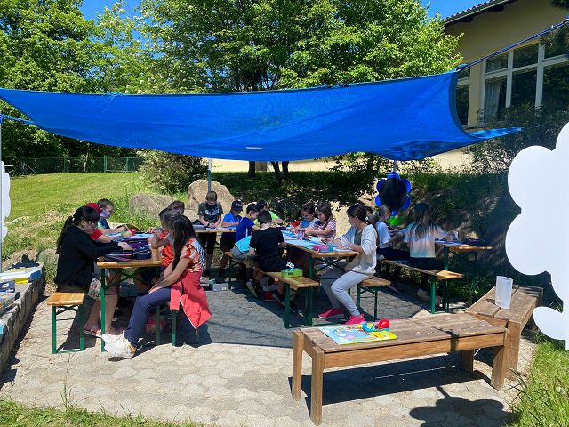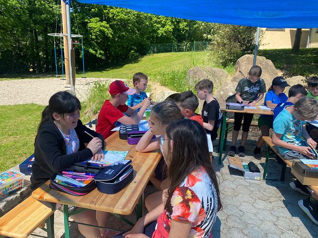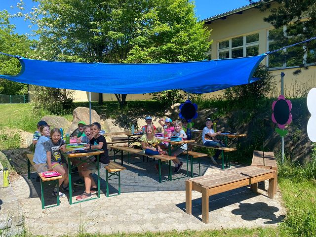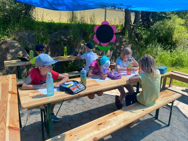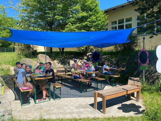 Die Errichtung einer sogenannten „Outdoorklasse“ ist schon seit einiger Zeit ein Ziel unserer Unterrichtsarbeit. Im letzten Sommer wurde der Platz dafür von einigen freiwilligen Helfern gepflastert und in diesem Jahr wollten wir die Klasse im Freien erstmals nutzen. Bei herrlichem Wetter wurden letzte Woche einige Unterrichtsstunden in unserem „Schulgarten“ abgehalten. Die Kinder konnten die frische Luft und die Natur genießen und das Sachunterrichtsthema „Die Wiese und ihre Bewohner“ wurde gleich praxisnahe behandelt.