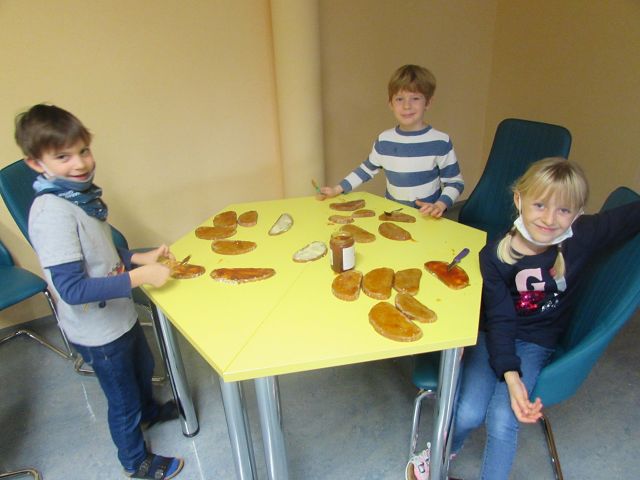 In den letzten Wochen waren viele Dinge, die geplant waren, nicht möglich. Doch heute am 16.12.2020 wurden in unserer Schulküche wieder fleißig Obst und Gemüse geschnitten und leckere Brote gestrichen. Unsere Kleinsten in der 1a – Klasse richteten mit viel Eifer für alle Mitschülerinnen und Mitschüler eine gesunde Jause her. Die Kinder durften in der Pause die Brote dann auch in den Klassen verkaufen. Das hat allen wirklich großen Spaß gemacht!