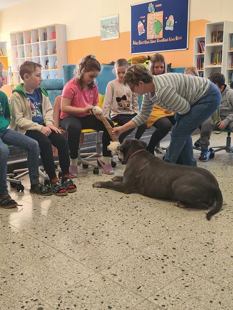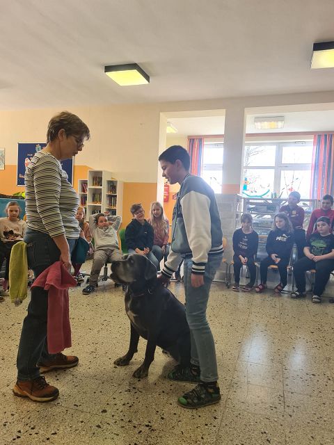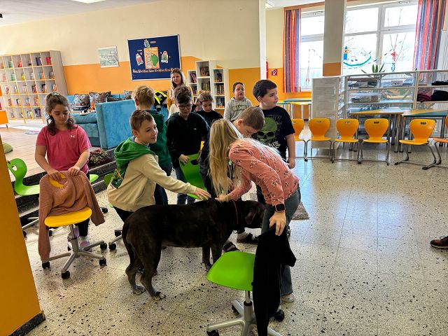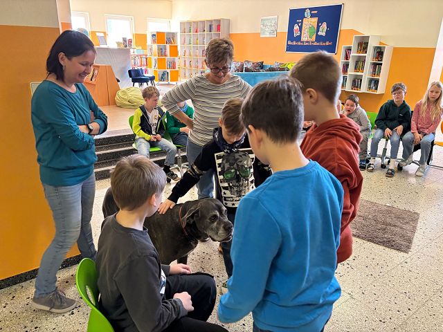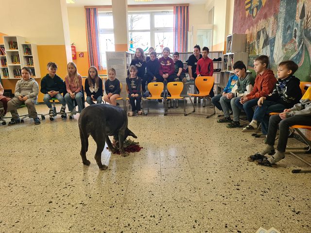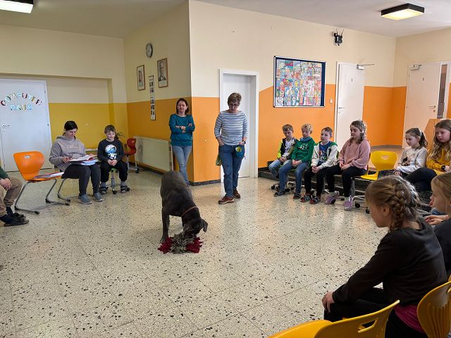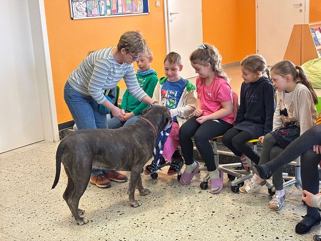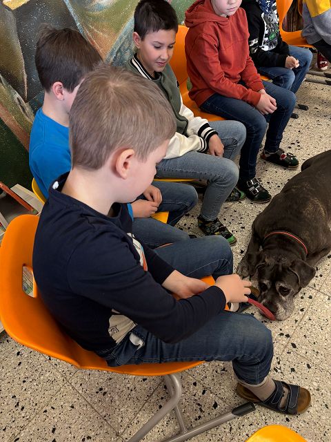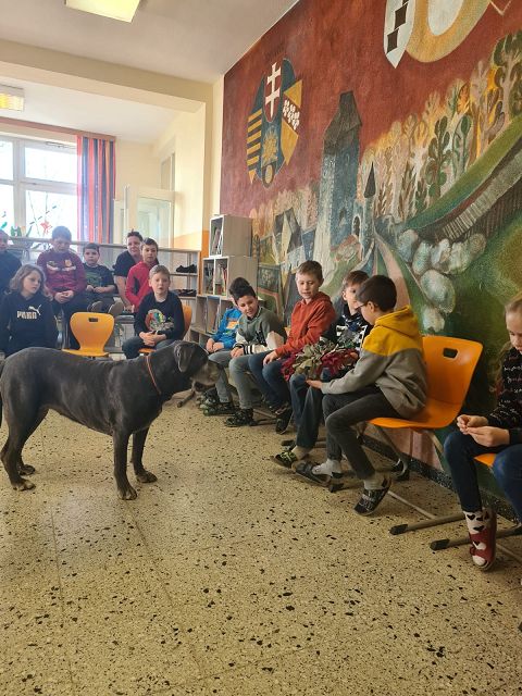Unsere Schule hatte am Montag, den 24. Februar 2025 Besuch eines Therapiebegleit-hundeteams. Die Cane Corso Hündin Zoe und Frau Mag. Gabriele Michalek, geprüft vom Messerli-Forschungsinstitut der Veterinärmedizinischen Universität Wien, lernten mit den Kindern der 3. und 4. Klassen altersentsprechend den korrekten und sicheren Umgang mit Hunden, insbesondere im öffentlichen Raum.