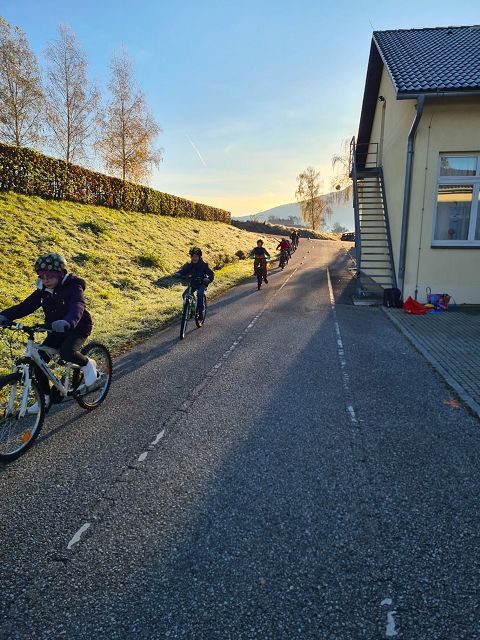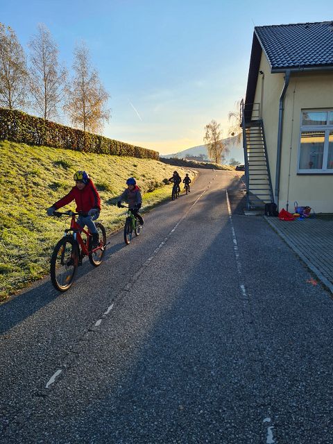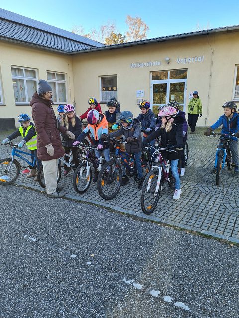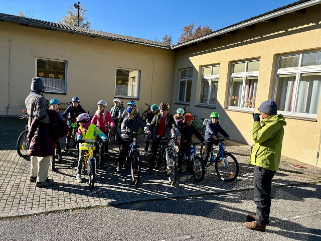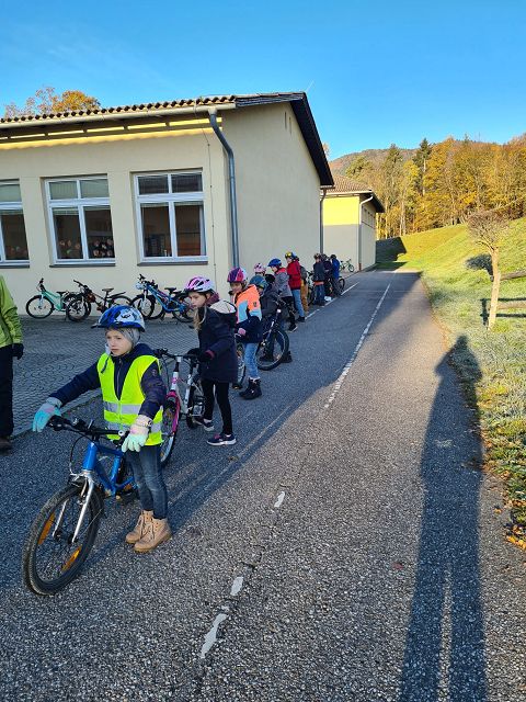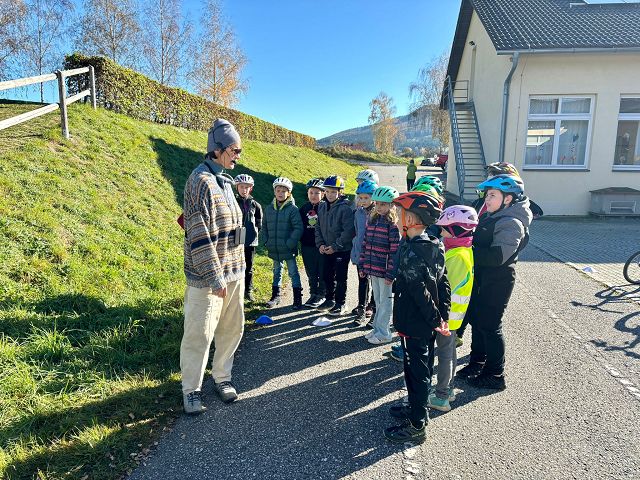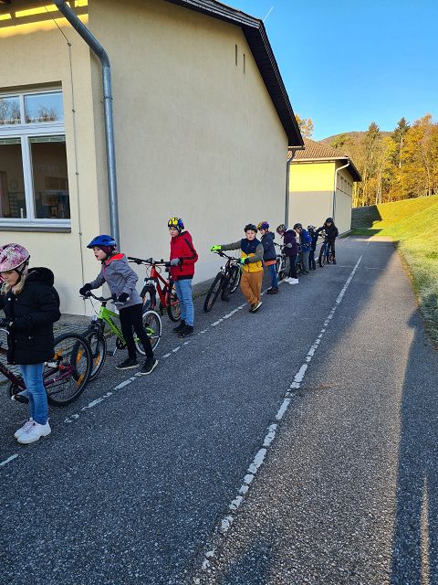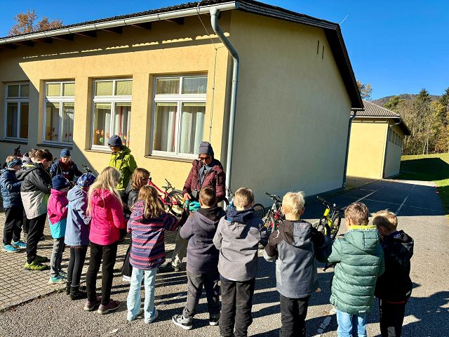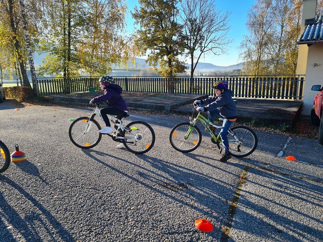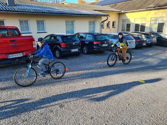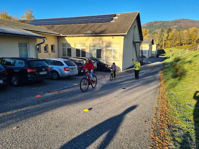 Groß war die Freude der Schülerinnen und Schüler der 3. Klassen, als sie hörten, dass sie am 4.11.2024 bei der Aktion „klimaaktiv mobil Radfahrkurs“ teilnehmen: Nachdem der Helm bei allen Kindern richtig eingestellt wurde und das Fahrrad auf Verkehrstüchtigkeit geprüft wurde, ging es auch schon los. Zuerst wurde das Starten und Bremsen trainiert. Hierbei wurde auch veranschaulicht, was bei einem falschen Bremsmanöver passieren würde. Danach wurde der Schulterblick und das Links-Abbiegen sowie das Ausweichen bei einem Hindernis auf der Fahrbahn besprochen und geübt.